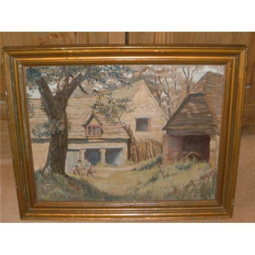 ENGLISH OIL ON PANEL ENTITLED 'COTSWOLD FARM' BY WILLIAM MCALLISTER TURNER 1901 - A.R.C.A (ASSOCIATE OF THE ROYAL CAMBRIAN ACADEMY ) F.R.S.A ( FELLOWSHIP OF THE ROYAL SOCIETY OF ARTISTS ).<P>