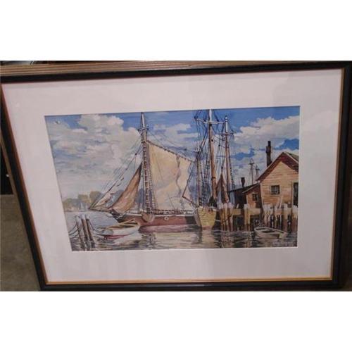 20TH Century Oil On Paper Gouache of a Sailboat at Dock with two row boats. Signed G. Honickman and dated 1984. Beautiful colors with a nice blue sky with scattered clouds and sailboats iun the background. This could be from the Mid-Atlantic Area and the setting could be Annapolis or somewhere in the Washington, D.C./Baltimore Harbor Area. The painting is 28 3/4" X 22 3/4" and is mounted in a frame that is 31 1/4" X 24 3/4". Additional images are available upon request.