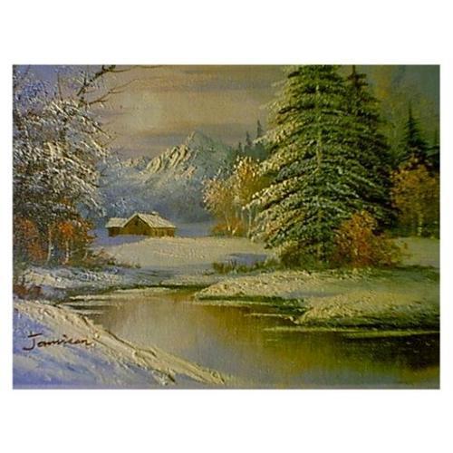 THIS IS A BEAUTIFUL PAINTING OF A CABIN IN THE WINTER WOODS. IT IS SIGNED. IT IS UNSTRETCHED & UNFRAMED. MEASURES 16" X 20".