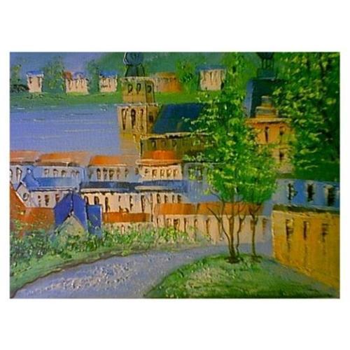 THIS IS A BEAUTIFUL PAINTING OF A SMALL TOWN LOCATED ON THE WATER. IT IS SIGNED. IT IS UNSTRETCHED & UNFRAMED. MEASURES 8" X 10".