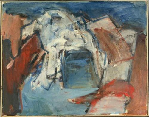 OIL ON CANVAS 23'' x 30''. Eugene Pizzuto (1925-2004), WA. Unsigned. An abstract composition in red, blue, and white colors. A longtime UW painting professor Pizzuto was well known for his abstract landscape paintings. His paintings were often on exhibit at the Henry Art Gallery and galleries throughout the world. More info in the white binder.