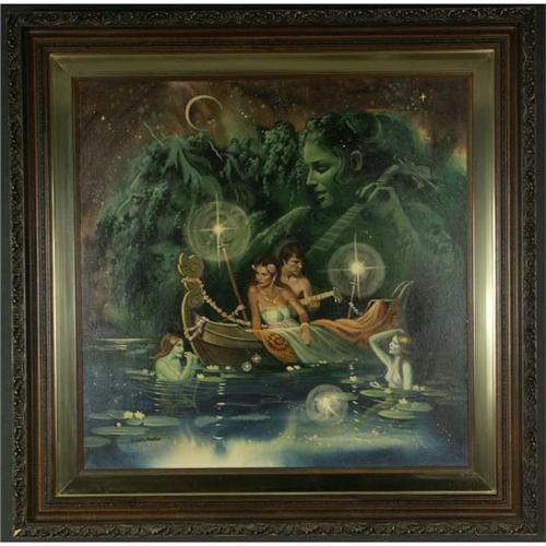 OIL ON CANVAS 34'' x 34'', B.Whittaker. A Man Serenading a Woman Amidst Mythological Imagery. Signed lower left. Placed in a wood and compo. frame with gold trim. 45'' x 45'' framed.