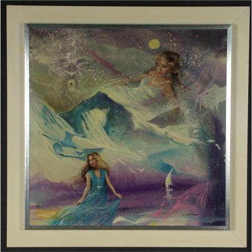 OIL ON CANVAS 27.5'' x 27.5'', B.Whittaker. Glamourous Women Surrounded by Wind Imagery. Signed lower right. Placed in a fitted silver frame with off-white wood exterior molding. 34.25'' x 34.25'' framed.