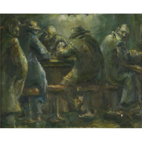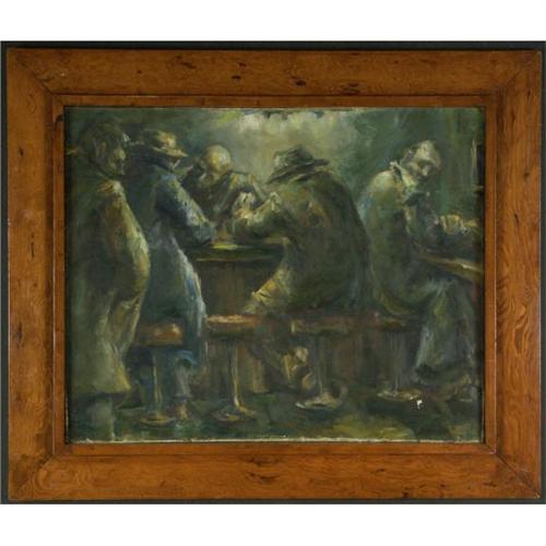 OIL ON CANVAS LAID ON PANEL 24 3/4'' x 30.5'', Unsigned. A Bar Scene. Note condition to include chipping lower right and some warping to the board. Placed in a wide oak frame.