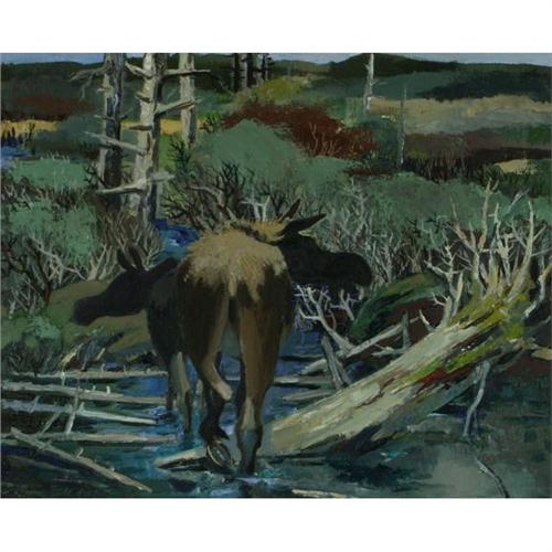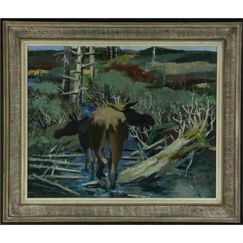 OIL ON CANVAS, Danny Pierce (1920-), WA. Moose Cow & Calf. Signed and dated lower right. Placed in a white-washed wood frame, frame as seen. More info. at the front desk. 24'' x 36''/ 31.25'' x 37'' framed.
