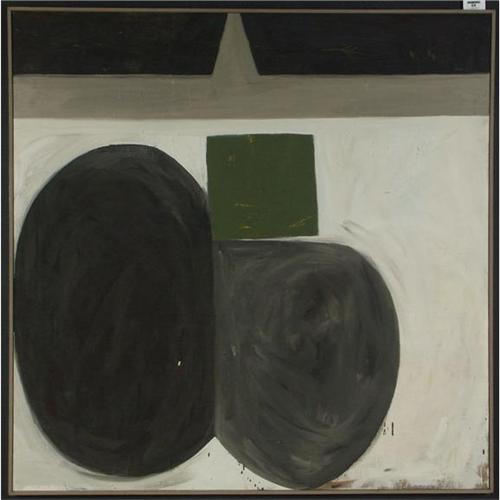 OIL ON CANVAS 43'' x 43.5'', Duane Zaloudek (1931-), NY. ''Trask XIII''. Unsigned. Title and dates ''1961-1964'' listed on the verso. Note condition to include a chip lower left. Placed in a beige wood frame. More info. in the white binder.