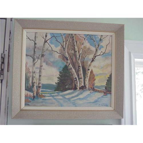 Wonderful vintage original oil on board painting of a winter scene. The painting is most attractive with lovely subtle colors. Its still in its original frame from the 1940s or early 50s. The painting measures 17 inches by 15 inches and is in great condition-no damage. Signed 'F.Waldorf'.A most decorative painting to decorate with and add to your collection of primatives or folk art.