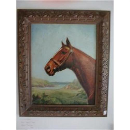 </font></strong>Very well exucuted Oil on Board Painting of a Horse. Painted by Harriet Laforet. in 1947. Possibly the year the Horse "Man O'War", was winner of a important Horse-Race. The proud owner of the horse liked to have a longtime memory of there Thoroughbred Horse, and commissioned Harriet Laforet to paint him. The Artist did a great job, I did have Thoroughbreds, see painted him, you think he is alive. The painting is in very good condition, no fading of color, no restoration. The painting is in a beautiful wooden frame, very appropiete for the object. Dimentions: 26 1/2 x 22 1/2 inches including th frame. The Frame is 3 1/4 inches wide. Buyer pays S/H Insurance $ 25.00. </font>