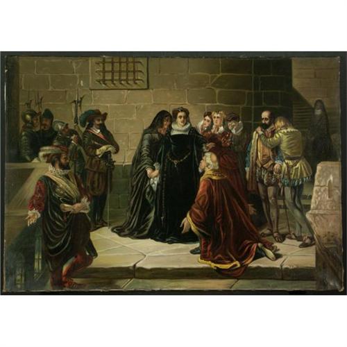 OIL ON CANVAS 31.25 x 44.75'', J.H. Miebach, Germany. Beheading of Mary, Queen of Scots. Signed and dated ''1892'' lower right. Note condition to include small tear upper left and possible overpainting spots throughout. Unframed.