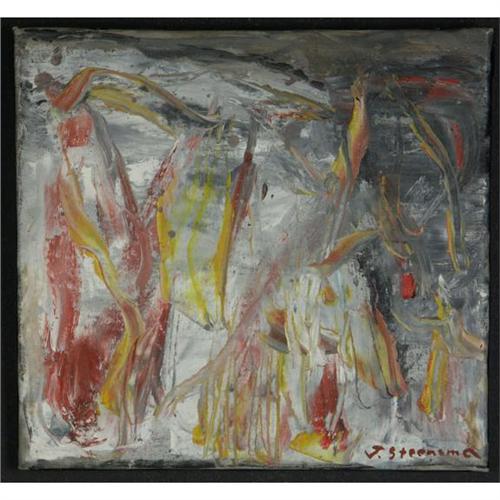 OIL ON CANVAS, Jay Steensma (1941-1994), WA. An Abstract Composition in Red, Yellow, Gray & White. Signed lower right. Inscriptions on the verso. Unframed. More info. at the front desk. 12.5'' x 13.5''.