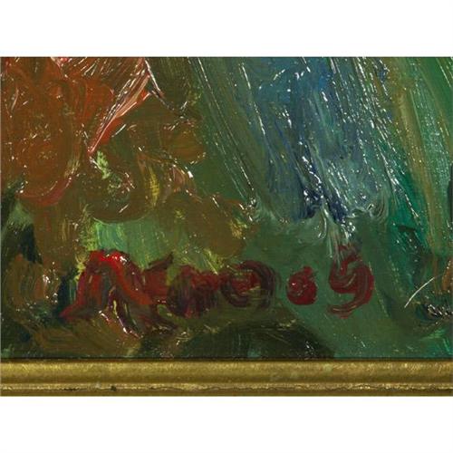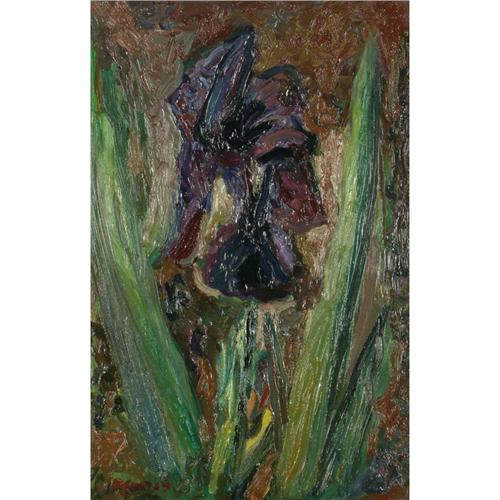 OIL ON BOARD, Joe Reno (1943-), WA. ''The Peeking Iris''. Signed and dated ''05'' lower left. Info. on the verso. Placed in a goldtone frame. More info. at the front desk. 25.25'' x 16.5''/ 28'' x 19.25''.