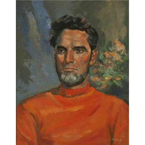 OIL ON CANVAS 20'' x 16'', John Plumer Ludlum (1906-1993), NY/CA. ''(Portrait of) Alan Perault''. Signed lower right. Titled on the verso. Placed in a wood and compo. frame with white velvet matting and gold trim. 25.5'' x 21.5'' framed.