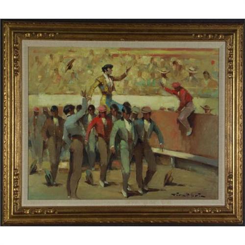 OIL ON CANVAS 24'' x 30'', Juan Giralt Lerin (1907-?), Spain. A Victorious Matador. Signed lower right. Placed in a goldtone compo. frame with off-white fabric matting. More info. in the white binder.