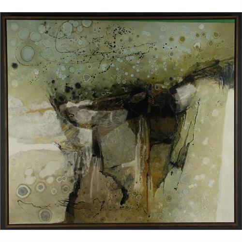 OIL ON CANVAS: Kathleen Gemberling Adkinson (1930-), WA.; Represented by Woodside/Braseth Gallery, Seattle, WA., Former student of Mark Tobey. Oil painting titled ''Crystal Mountain Cavern''. Signed ''Gemberling Adkinson'' lower center left. Titled on the verso. Includes an exhibition catalog from the Woodside/Braseth Gallery. 45.25'' x 50.25''/ 46.25'' x 51.5'' framed.