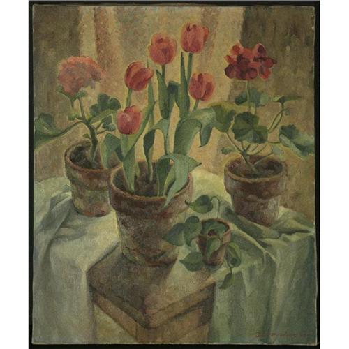 OIL ON CANVAS 24'' x 20'', Leon F. Derbyshire (1896-?), Seattle, WA. Potted Tulips. Signed and dated ''52'' lower right. Artist info. on the verso. Unframed. More info. in the white binder.