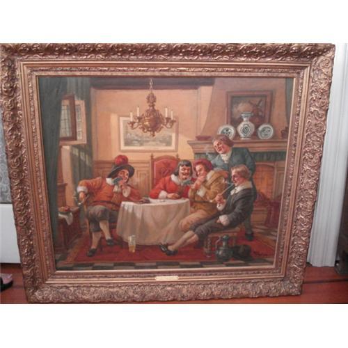 Fabulous old oil paiting on canvas by International listed German Artist Hermann Prediger Born in Hamburg 1886. This large oil painting is of a charming antique interior scene with old card players. The painting is rich with details ,beautifully painted. Even the painting's paintings are detailed.