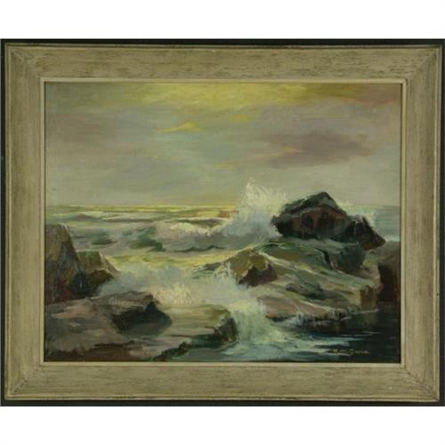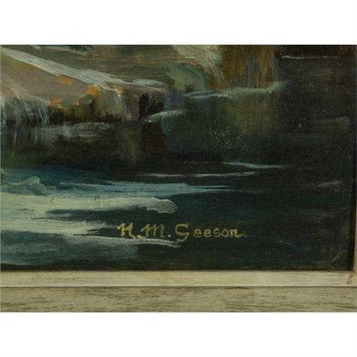 OIL ON PANEL 21.5'' x 27.5'', M. N. Geeson. A Crashing Wave Seascape. Signed lower right. Placed in a white-washed wood frame. 27'' x 33.25'' framed.
