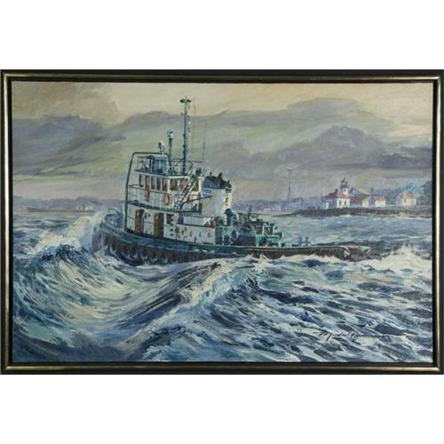 OIL ON CANVAS, Marshall Johnson, WA. ''Rounding Alki''. Signed lower right. Signed, dated ''1981'' and titled on the verso. Stillwater Gallery label on the verso. Floating presentation in a wood frame with gold trim. More info. at the front desk. 24'' x 36''