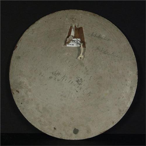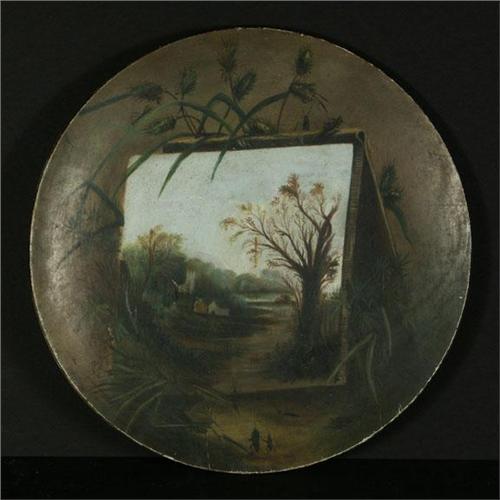 OIL ON PANEL 12'' x 12'' (circular), Alice McKitterick (late 19th century). ''(?) English Scene'', Trompe-l'oeil Painting within a Painting. Artist, date (''1875''), title, and notations on the verso. Unframed. Note condition to include scratches and drip mark.