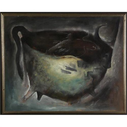 OIL ON CANVAS, Neil Meitzler (1930-), WA. An Ethereal Bull with Bird Forms. Signed on the verso. Page from past sale at Butterfield & Butterfield on the verso. Note condition to include small tear upper right. Placed in a simple silvertone wood frame. More info. at the front desk. 24'' x 30''/ 25.25'' x 31.75'' framed.