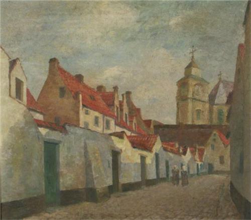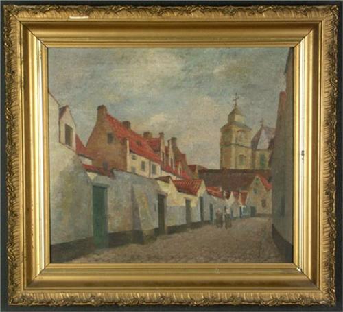 OIL ON PANEL 18'' X 20 1/4'', Unsigned. European town scene of two nuns walking through a nunnery. Circa early to mid 20th century. Placed in a gilt frame, note condition.
