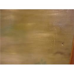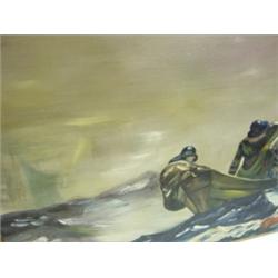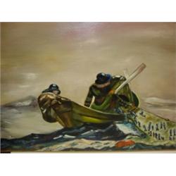 OIL PAINTING OF FISHERMEN. On canvas. Depicts two fishermen in boat at sea. Damaged at right section of painting. 42.5" x 24.5" unframed. Unsigned.