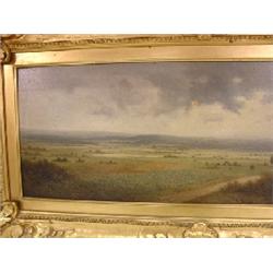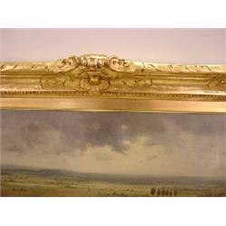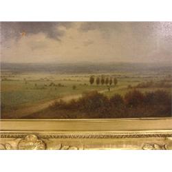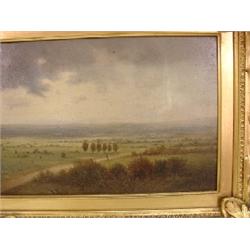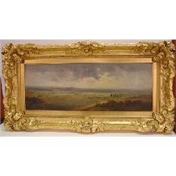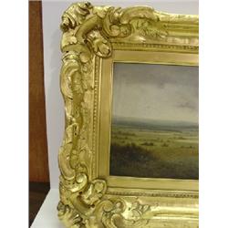 OIL ON BOARD PAINTING OF LANDSCAPE. Circa 19th century. Signed in lower right “Fr. Dumont”. In ornate gilt frame. 8” x 21”. 15” x 28” framed.