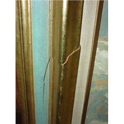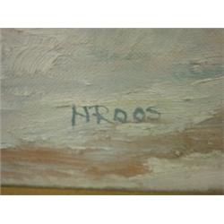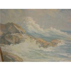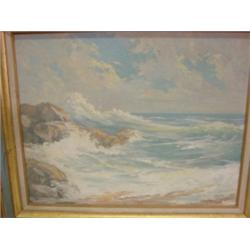 OIL PAINTING OF SEASCAPE. On board. Depicts waves breaking on rocks. Signed in lower right "H. Roos". Frame is cracked at left side. 36.5" x 31" framed.