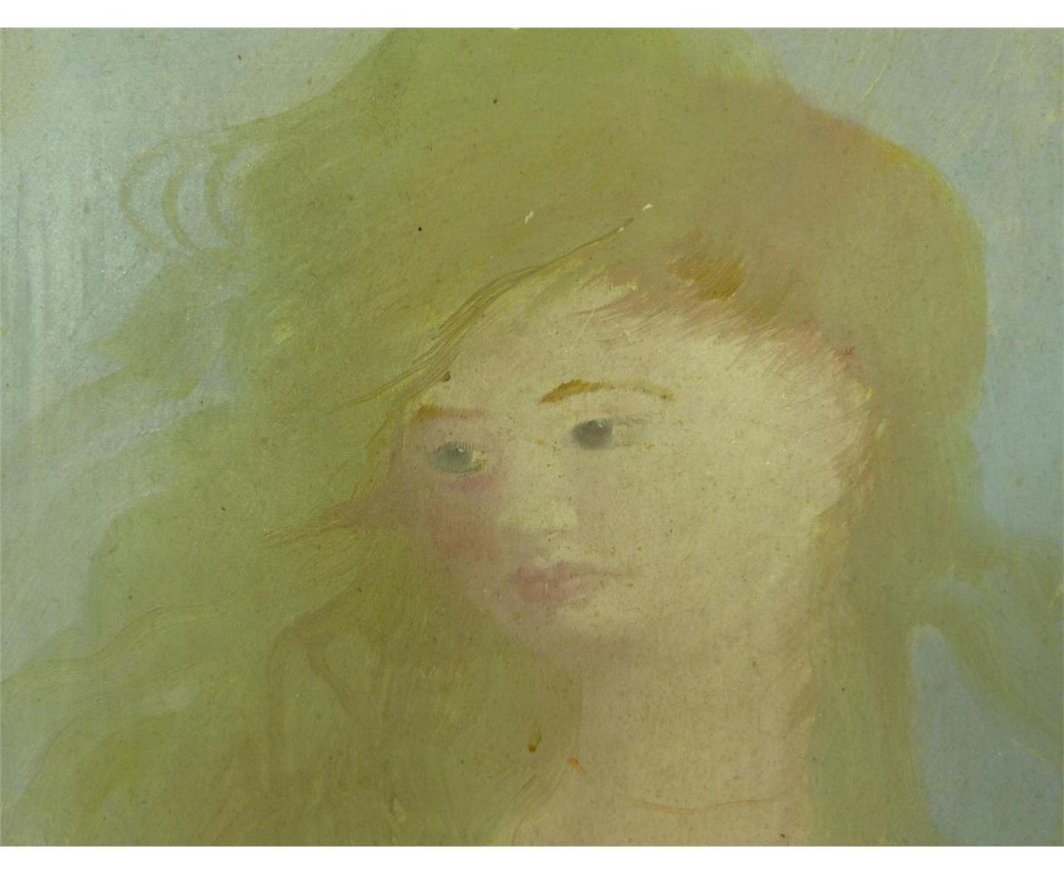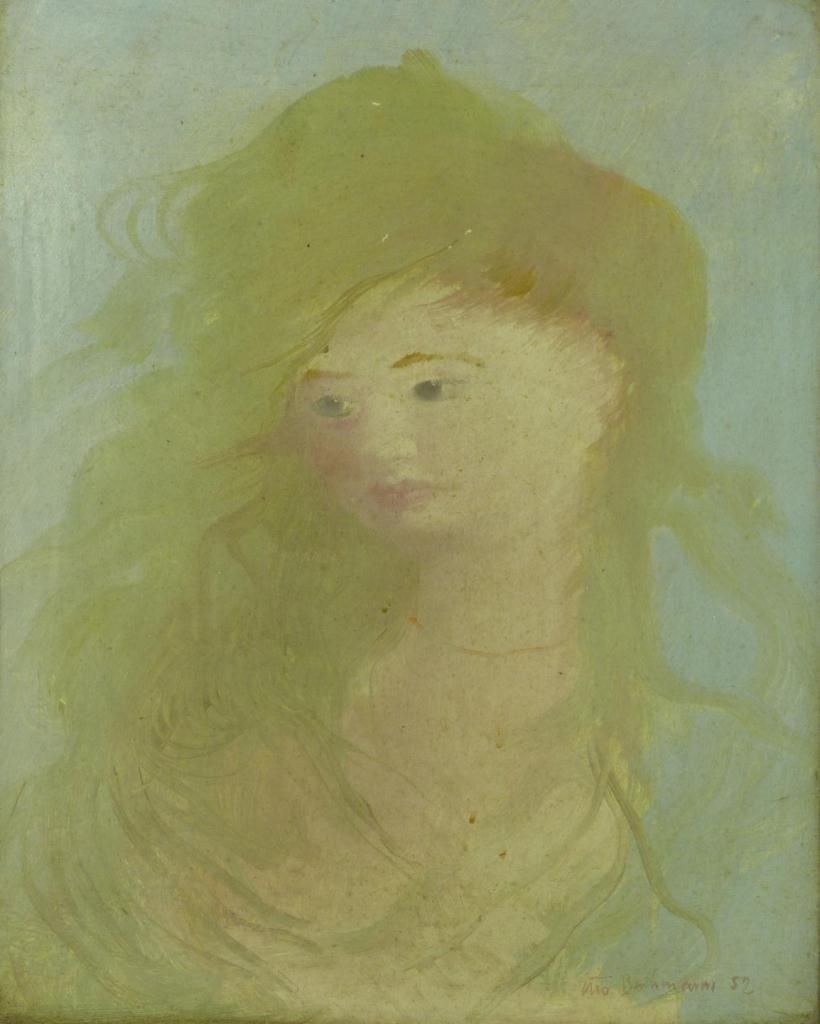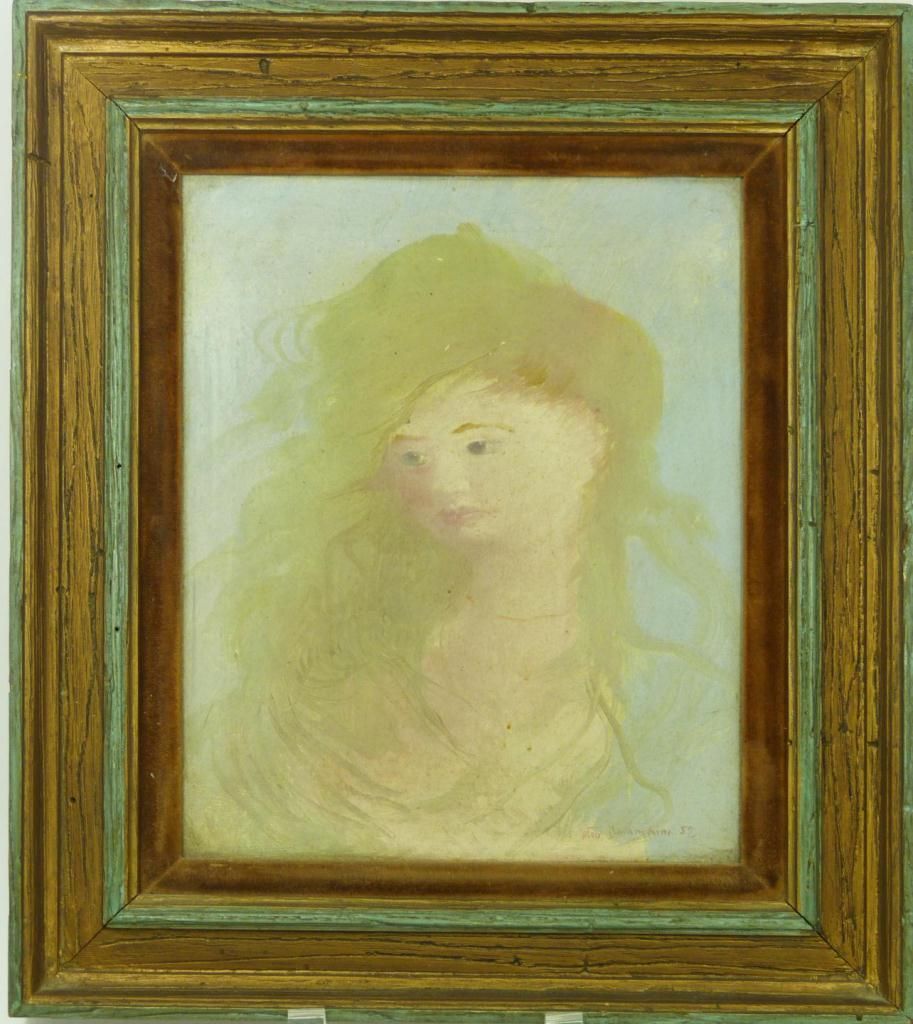 Oil painting on board depicting the portrait of a girl. Signed lower right and dated '52. Mounted in wooden frame. Measures 10 1/2" height x 8 1/2" width + 2" (26.6cm x 21.5cm + 5.1cm).