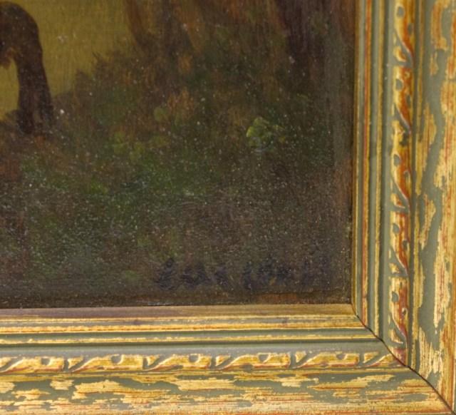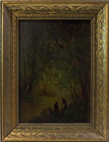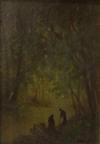 Depicts two figures standing on the bank of a river with a forest surrounding. Signed lower right. 8 3/4" height x 6" with + 1 1/2" matte & frame. Signature Illegible.