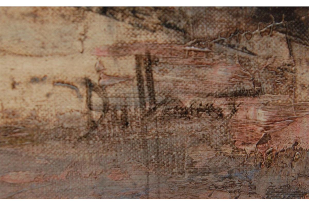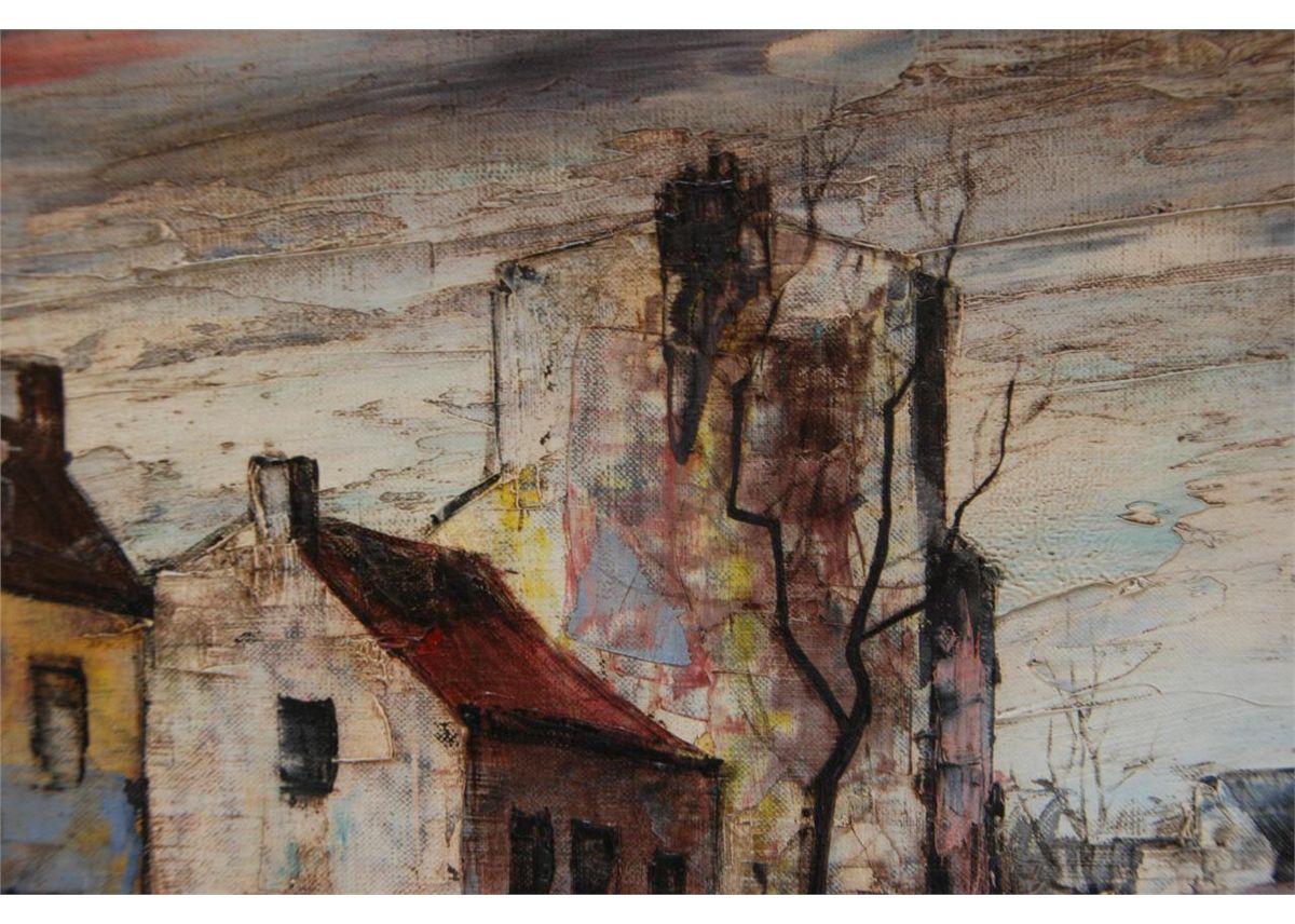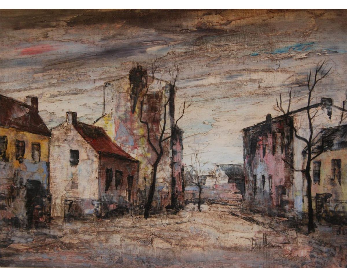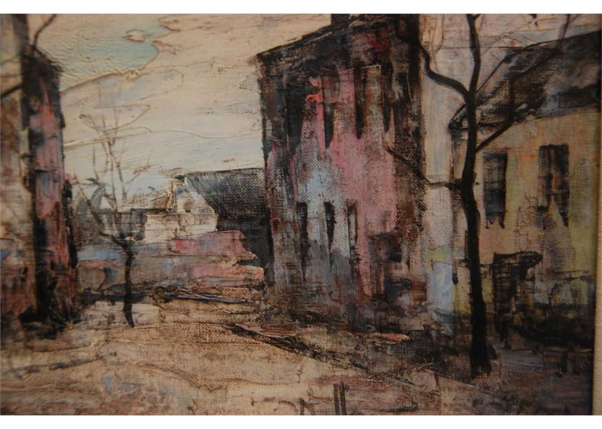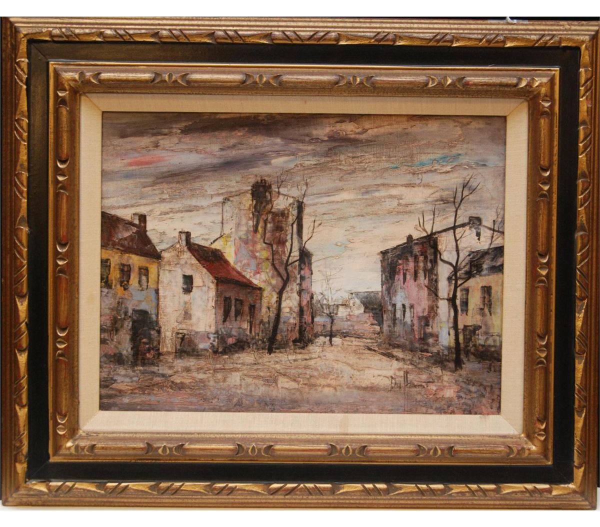 Oil painting on canvas depicting a street scene with bare trees. Signed to lower right. Mounted in black and gold wooden frame. Measures 12" height x 16" width + 3 1/2" frame (30.4cm x 40.6cm + 8.9cm).