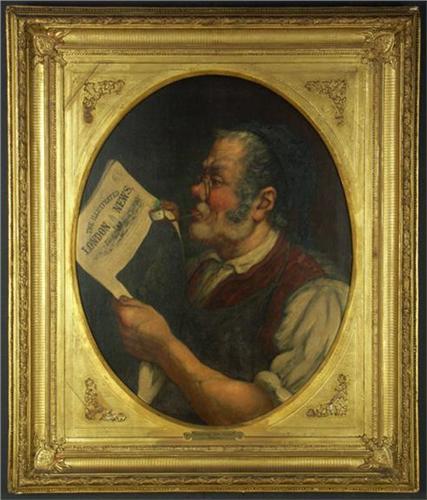 OIL ON CANVAS 26'' X 21'', Unsigned. A gentleman reading ''The Illustrated London News'' entitled ''Reading the News''. Inscribed 'L. Duval' on the metal plaque, lower center. Circa 19th century. Placed in an ornate gilded frame, note condition.