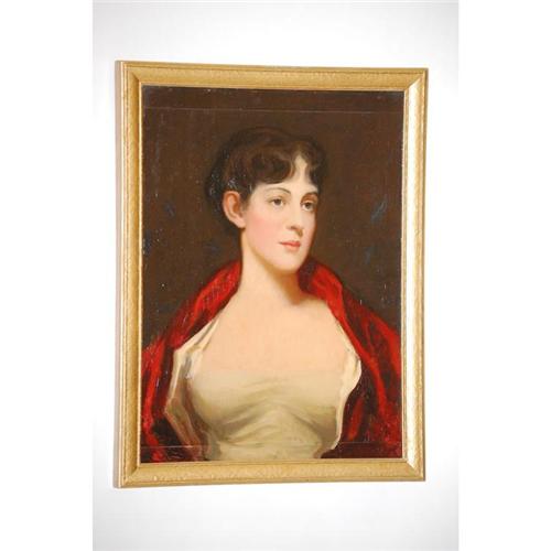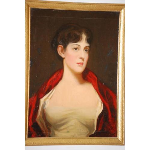 OIL PAINTING PORTRAIT ON WOODEN BOARD - 20TH CENT.<BR>OIL PAINTING ON BOARD W/ BREADBOARD ENDS OF YOUNG<BR>WOMAN IN A WHITE GOWN W/ A RED CAPE (19TH CENT.<BR>CONTINENTAL STYLE)-UNSIGNED IN A GOLD PAINTED FRAME<BR>(24.5" X 18")-LIGHT WEAR, IMPERFECTIONS