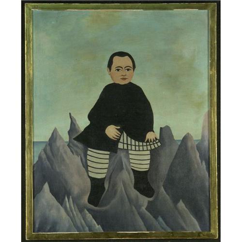 OIL ON CANVAS 19.25'' x 15.75'', Unsigned. Primitive Style Figure Sitting on Sharp Rocks. Placed in a simple goldtone frame, frame as seen. 21'' x 16.75'' Framed.