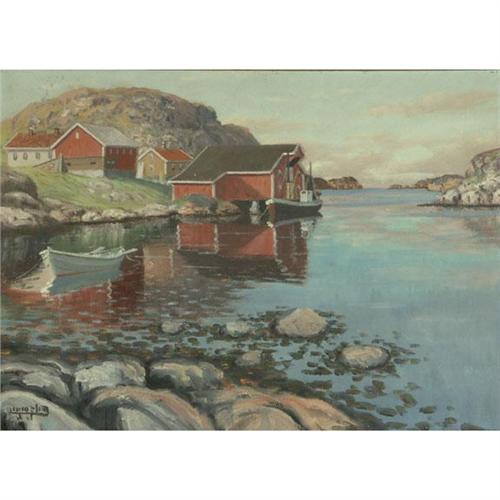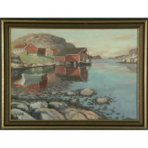 OIL ON BOARD 17.25'' x 24'', Indistinct signature. A Quiet Harbor Scene. Signed lower left. Placed in a simple period frame, frame as seen.