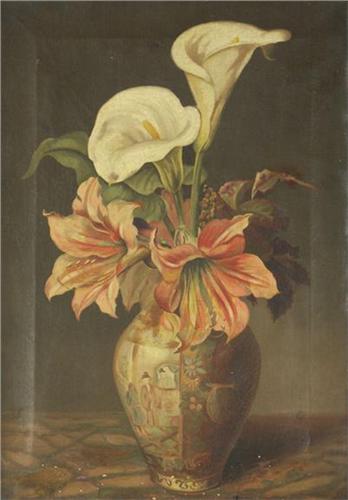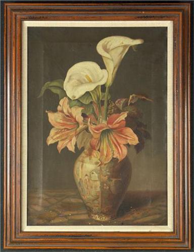 OIL ON CANVAS 20'' X 14'', Unsigned. Still life with flowers in a Chinese vase. Circa late 19th, early 20th century. Note condition including repair and paint chipping. Placed in a wood frame.