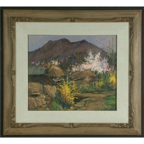 OIL ON CANVAS, Yuo Sung Won. A Landscape with Spring Foliage. Signed lower right. Matted with fabric matting and gold trim and placed in a carved wood frame. 17.5'' x 20''/ 29'' x 32'' framed.