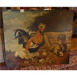 36" tall and 42" wide, Large Oil on canvas of a barnyard scene with a colorful cock sheltering his family of 2 hens and 6 chicks, blue sky and trees in the background. Artist signed in lower right (Scholei? Scholer?). Crackelure in varnish layer.