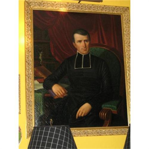 VERY LARGE OIL PORTRAIT OF A CLERGYMAN FROM ROUFFACH, FRANCE BY SWISS ARTIST GEORG BALDER (OR BALDERER) 1810 - 1882. IT IS AN OIL ON CANVAS IN VERY ATTRACTIVE GILT FRAME. THE PAINTING IS INSCRIBED "COLLEGE DE ROUFFAC' ON BOOK. IT IS SIGNED AND DATED 'GEORG BALDER. PT./3 AUGUT/1852' ON CHAIR ARM AT LEFT RIGHT.