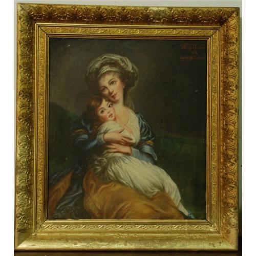 DESCRIPTION: PORTRAIT OF VIGEE LE BRUN AND HER DAUGHTER. DATED 1894. This painting is an exceptional reinterpretation of the homonymous painting by Marie Louise Elisabeth Vigée-Lebrun. Inspired by Angelika Kaufmann?s composition, this image of the maternal tenderness is linked with the sentimentalism present in Greuze?s paintings and the idyllic evocations of the childhood that was dear to the contemporary of Rousseau. Marie Louise Elisabeth Vigée-Lebrun was an exceptional woman and female painter, particularly of portraits, her style combining Rococo grace and delicacy with Neo-Classical ideals of simplicity and purity. Marie Louise Elisabeth Vigee-Lebrun was born in Paris in 1755 to Louis Vigée, a minor portraitist, and Jeanne Maissin, a hairdresser. She wrote in her Memoirs that her "love for painting declared itself in my earliest youth". Although her father died when she was only fifteen, she earned enough money painting portraits to support her mother and her younger brother. In 1778 Vigée-Lebrun painted her first portrait from life of Queen Marie Antoinette, which assured her career as a society portraitist. The unknown artist has faithfully reinterpreted the original masterpiece the ideal of Rousseau of the merry family, through the image of the devoted Mother. In this painting the artist reproduces Raffaello?s influences, in particular Our Lady of the Chair. The painter hugs her daughter just like Our Lady does with Jesus, giving emphasis to the mother figure. The ...