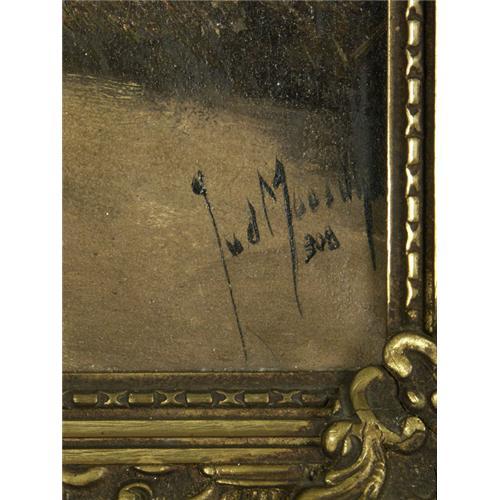 OIL ON CANVAS 19 7/8'' x 15 3/4'', Indistinctly signed and numbered lower right. A River Landscape. Late 19th, early 20th century. Surface darkening and streaking, as seen. Placed in an ornate wood and compo gilt frame, chipping as seen.