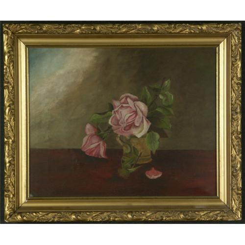 OIL ON CANVAS 12'' x 15'', Unsigned. Still Life of Roses. Early 20th century. Placed in a period goldtone frame, as seen.