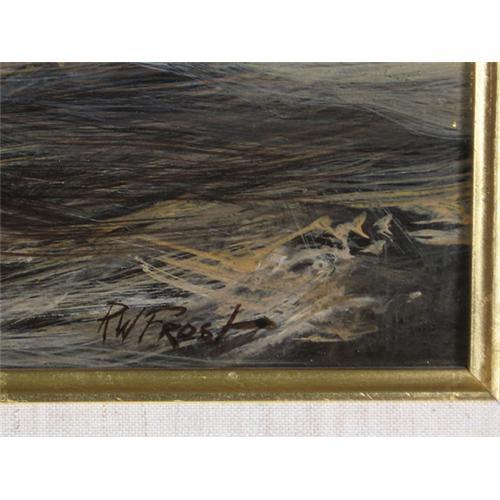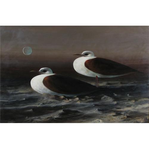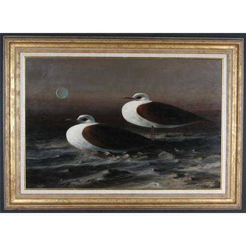 OIL ON BOARD 24'' x 36'', Russell W. Frost (20th century), WA. Two Seagulls Under a New Moon. Signed lower right. Placed in a goldtone frame with off-white fabric matting and gold trim. Frost and his wife Betty were both Northwest artists with a strong local following. His pieces were primarily represented by Gallery Mack in Seattle. More info. in the white binder.