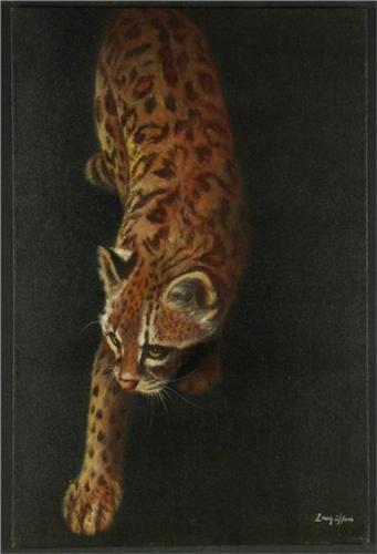 OIL ON CANVAS 36'' x 24'', Sonia Gil Torres (1936-), Florida. A stalking leopard cub. Signed lower right. Unframed. Torres, a native of Colombia, paints detailed images of wildlife and botanical arrangements. More info. in the white binder.