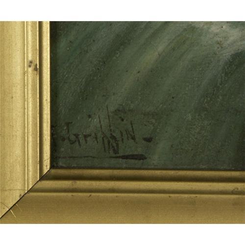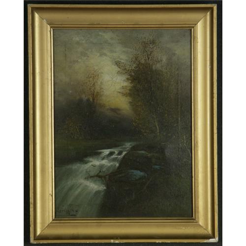 OIL ON CANVAS 11 1/2'' x 8 1/2'', T. Griffin. A Rushing Creek in an Atmospheric Landscape. Late 19th, early 20th century. Signed lower left. Note condition to include craquelure and restoration work upper and lower center.