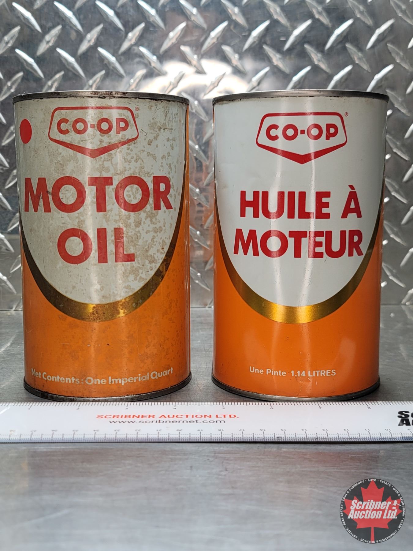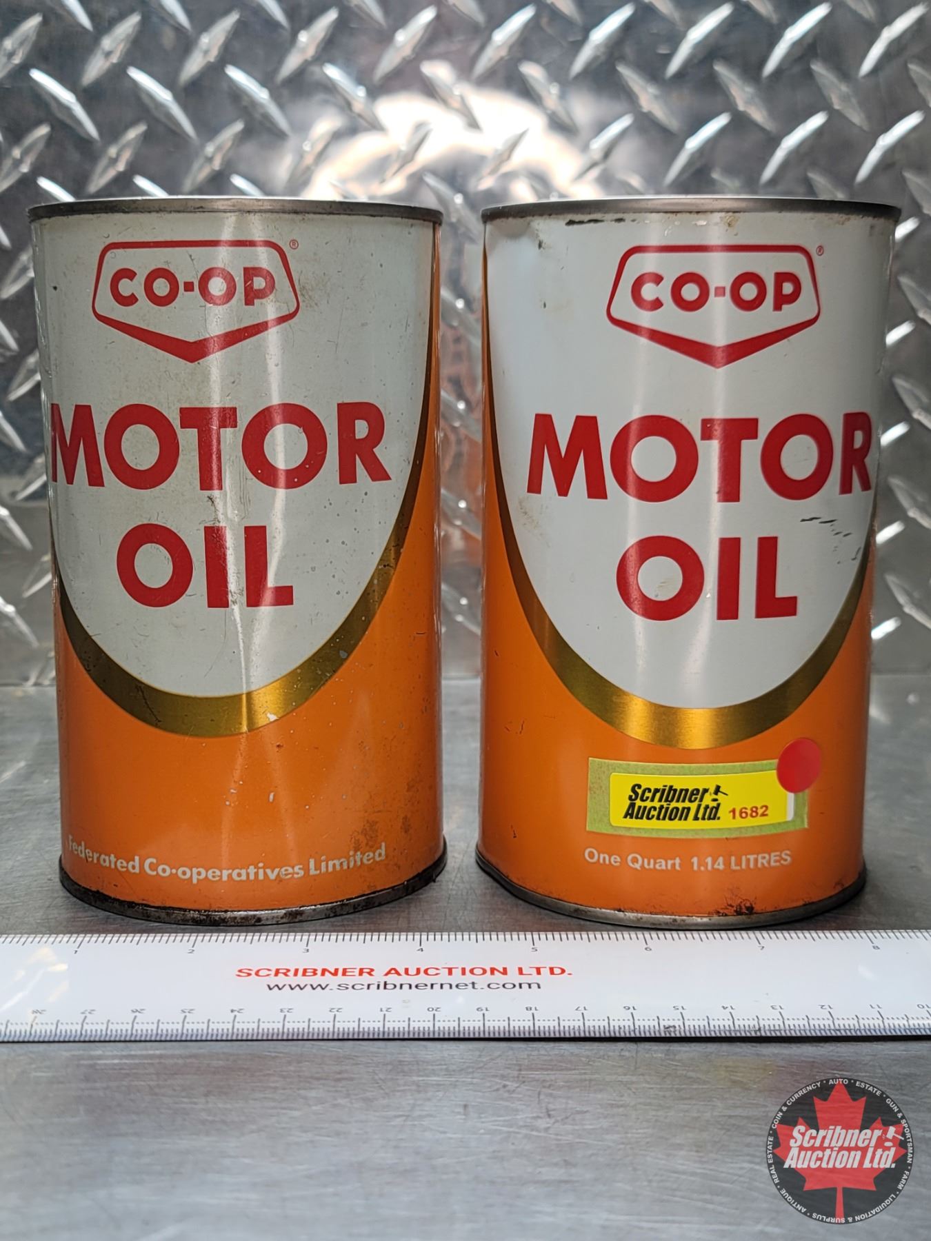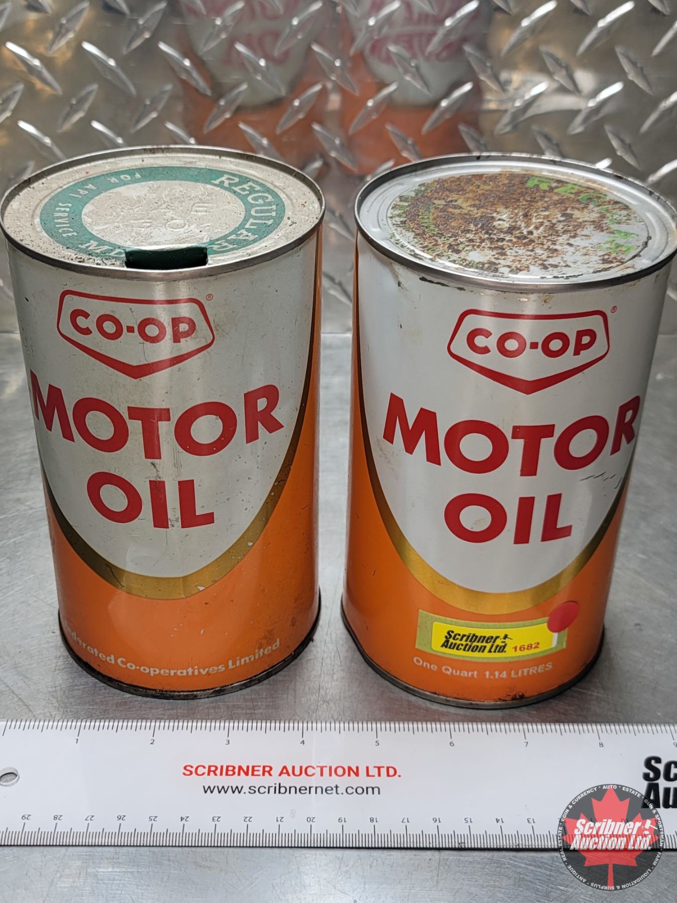 OIL TINS (2) : CO-OP MOTOR OIL (6-1/2"H x 4"Dia) (SEE PICS!)