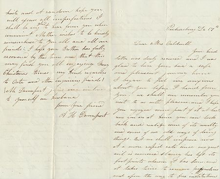 Good content A.L.S. mentioning oil wells, 4pp. 8vo., Parkersburg [W.V., n.d., ca. 1870] in which A. H. Davenport writes a lady friend. In part: "...Slavery has left its footprints wherever it has been and it takes time to remove prejudices...we look forward...to take our place among our more advanced sister states...plenty of oil and oil men and torn up streets and all that sort of thing...our church is prospering...the Darkey Church is still in existence. I often meet their Minister...He looks as straight and stiff as ever and I presume is feeding them on husks [?] yet. I hope there is better days yet in store for them...". Very good. Parkersburg was near the center of the West Virginia oil region of Burning Springs, and the first oil well came in less than a year after the Drake Well, the world's first oil well.