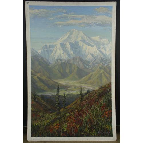 OIL ON PANEL 68'' x 44'', William Ballantine Dorsey (1942), CA. A Mountainous Landscape. Signed lower right. Note condition. Unframed. Inspired by Sydney Laurence and the early California Impressionists, Dorsey is a recognized twentieth century painter of California and Alaskan landscapes.