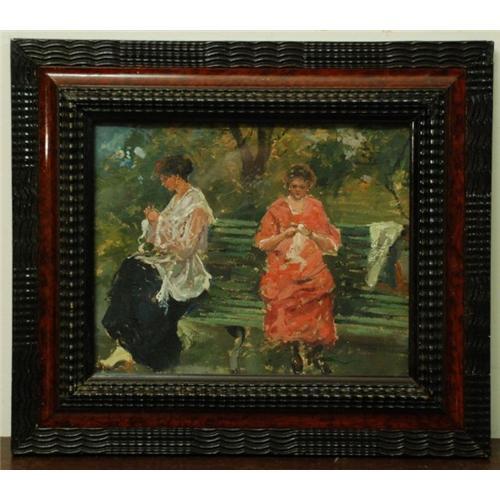 DESCRIPTIONS: WOMEN WORKS. The work that we propose you represents a quiet afternoon in which two women, sitting on a bench, immersed in the vegetation of a park or a garden, are devoted to sewing. A sensation of calm and serenity comes out. The green is the prevalent colour, interrupted only by the colours used in order to paint their clothes: a strong pink and a black and white. The brushstrokes are quick, typical of the impressionist style.