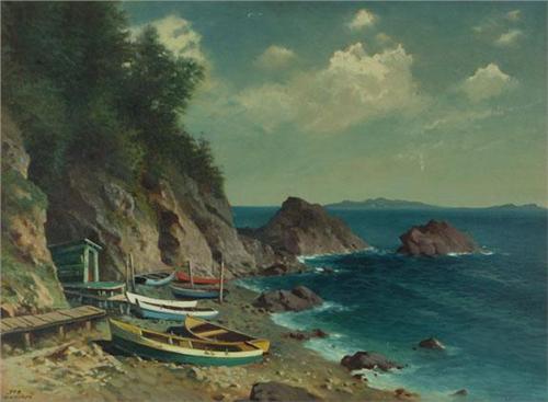 OIL ON CANVAS 23'' x 31, Yos Munihen. Fishing boats on the shore. Signed lower left. Inscribed on the verso ''Kleiner Fischerhafen auf Capri''. Circa early 20th century. Small paint scrappings upper center and center right. Placed in a painted wood frame.